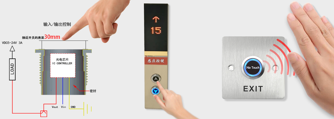 新款TF系列 Touch Free key switch.是我公司在原來PT系列光電觸摸開關基礎上的改進型,完美解決了按鍵類開關,必須用手接觸的工作原理,性能明顯優(yōu)于常見的電容式觸摸開關,在電梯按鈕,門禁系統(tǒng),醫(yī)療設備,公共場所的按鈕提供了無接觸式開關的先例。
