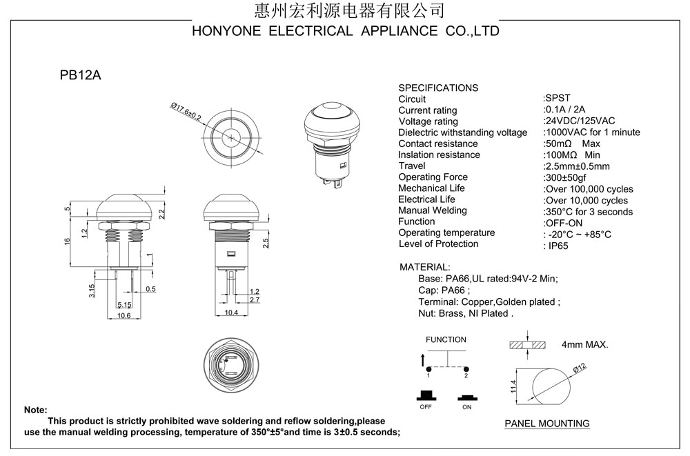 Dieletric withstanding voltage:1000VAC for 1 minute