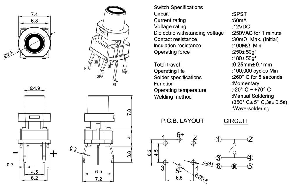 Operating Force                      :180±50gf or 250+50gf