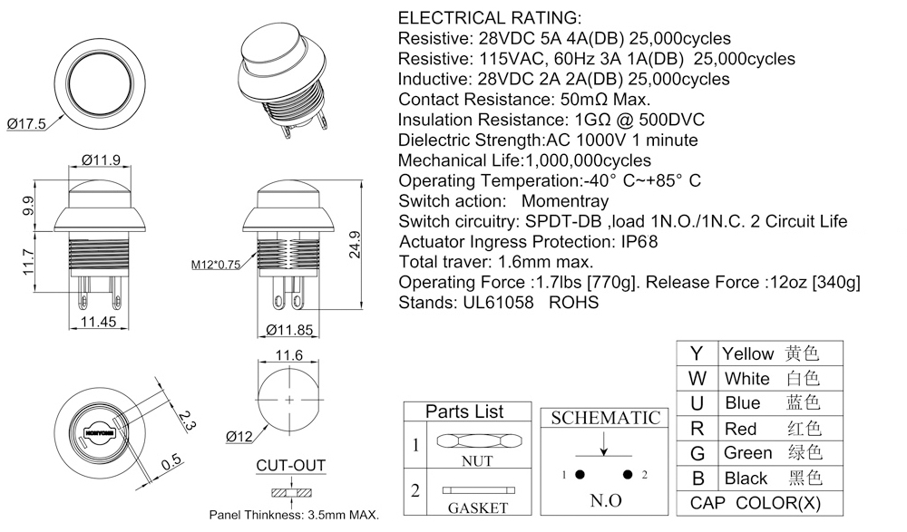 Resistive: 115VAC,60Hz 3A 1A(DB)25,000cycles