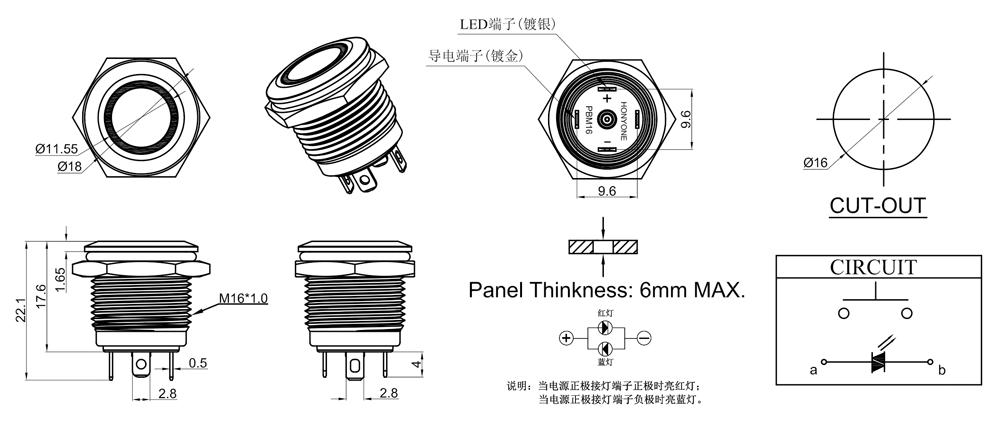 產(chǎn)品型號(hào):PBM16-11M-F-RU3-S0 雙色LED燈