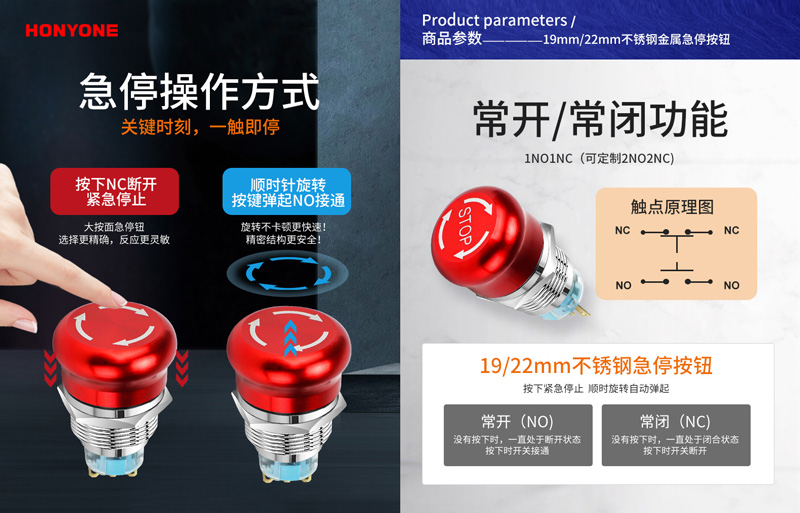 The emergency stop switch from the original plastic shell, to metal material development, HONYONE also timely launched the EBM series of all metal emergency stop switch, and at the same time there are emergency stop switch with indicator light,IP67 waterproof, IK10 riot function. In addition, in order to avoid misoperation, an anti-miscontact protection frame is also developed.
