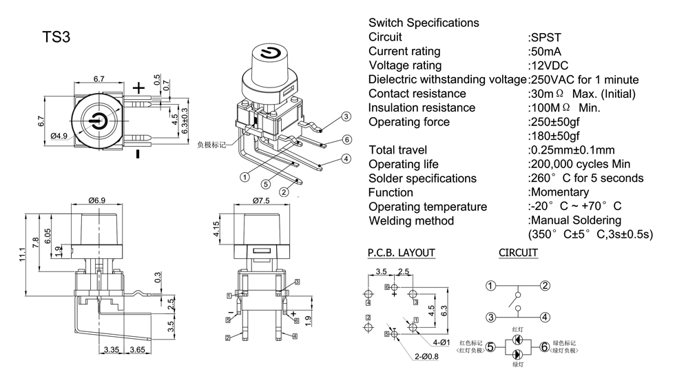 Operating Force                      :180±50gf or 250+50gf